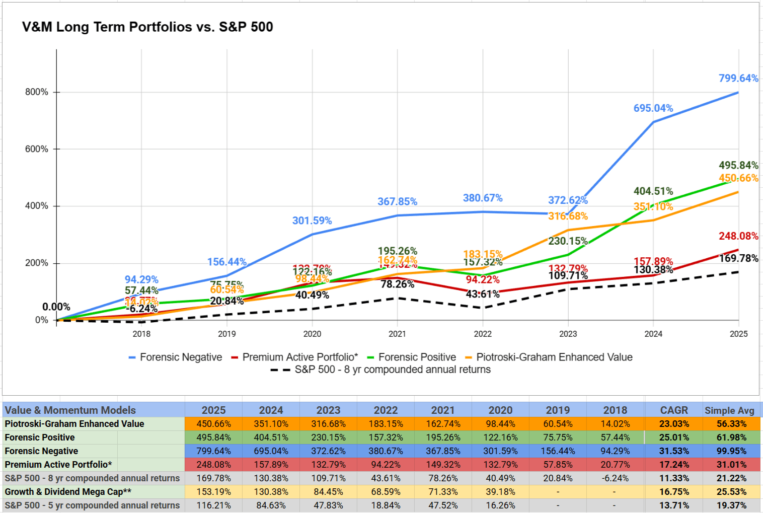 To try to answer questions about which is the best long term portfolio for you to consider, that is difficult to say. The biggest caution is that the negative forensic portfolio has seen by far the most delisted stocks for failing to meet exchange requirements or surprise acquisitions and the slack has been picked up by other stocks in the portfolio. A different long term portfolio has lead in nearly every year of the past 5 years. Cumulatively, they each continue to lead the S&P 500 in live forward testing since 2018. You can see some rotation in portfolio returns over the past 8 years with both or either of the Negative and Positive Forensic portfolios outperforming in most years.