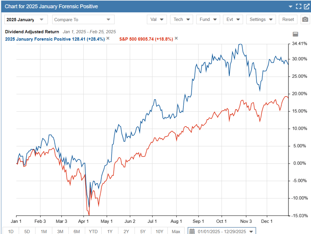 Both the January 2025 Positive/Negative forensic portfolios are positive YTD. Only the January Positive Forensic portfolio +28.4% returns adjusted for dividends, beat the S&P 500 +18.8% through December 29th this year.